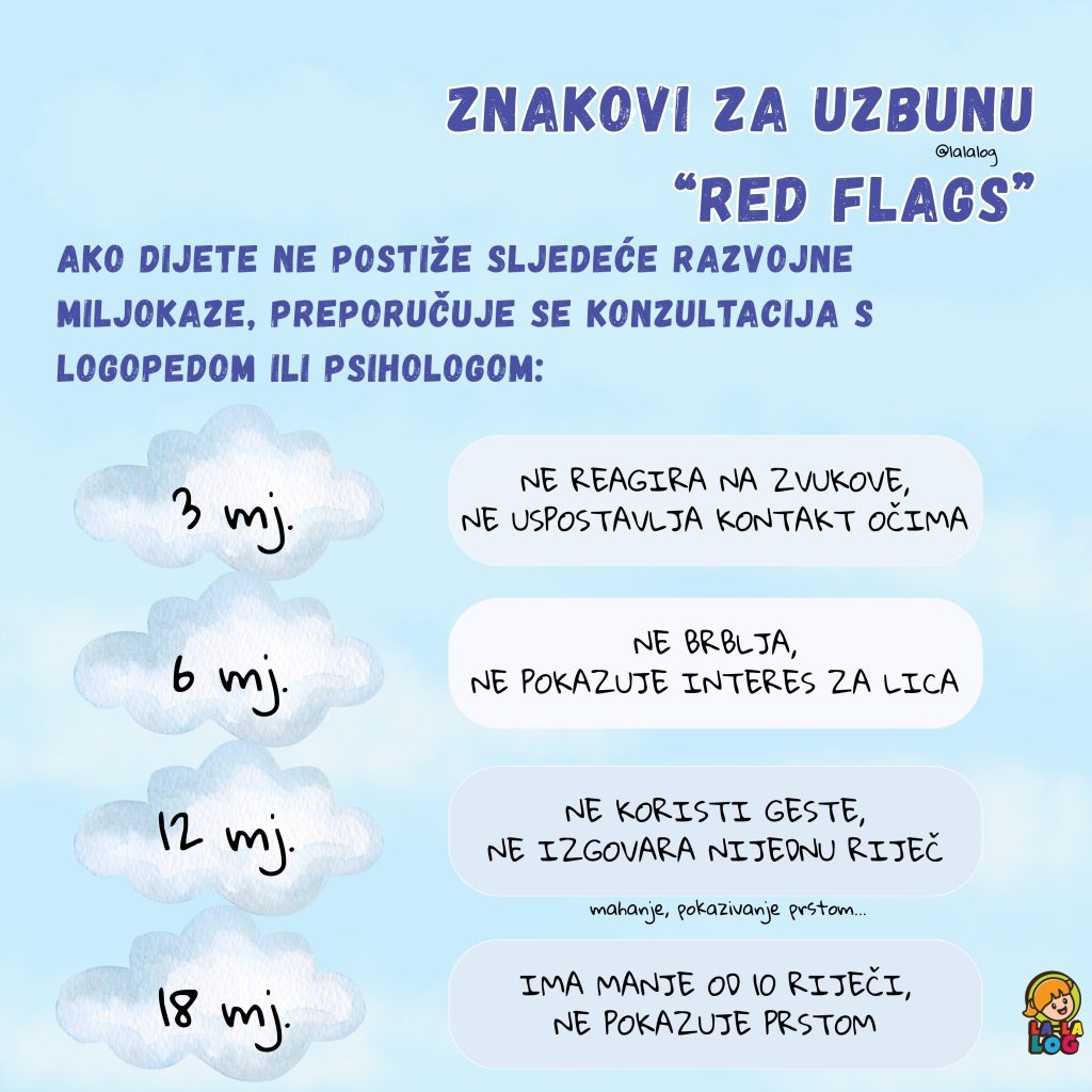 Unatoč individualnim razlikama, postoje određeni razvojni miljokazi koje bi dijete trebalo doseći u određenom vremenskom okviru. Ako dijete u dobi od tri mjeseca ne reagira na zvukove ili ne ostvaruje kontakt očima, to može biti rani znak odstupanja. U šestom mjesecu zabrinjavajući znak može biti izostanak brbljanja i izraženog interesa za okolinu. Ako u dobi od dvanaest mjeseci dijete ne koristi geste poput mahanja ili pokazivanja prstom te ne izgovara nijednu riječ, poželjno je konzultirati stručnjaka. Do osamnaestog mjeseca dijete bi trebalo imati barem deset riječi u rječniku, a ako to nije slučaj, preporučuje se procjena logopeda. Nadalje, ako u dobi od dvije godine dijete ne kombinira dvije riječi ili ne razumije jednostavne upute, također je važno potražiti stručno mišljenje.