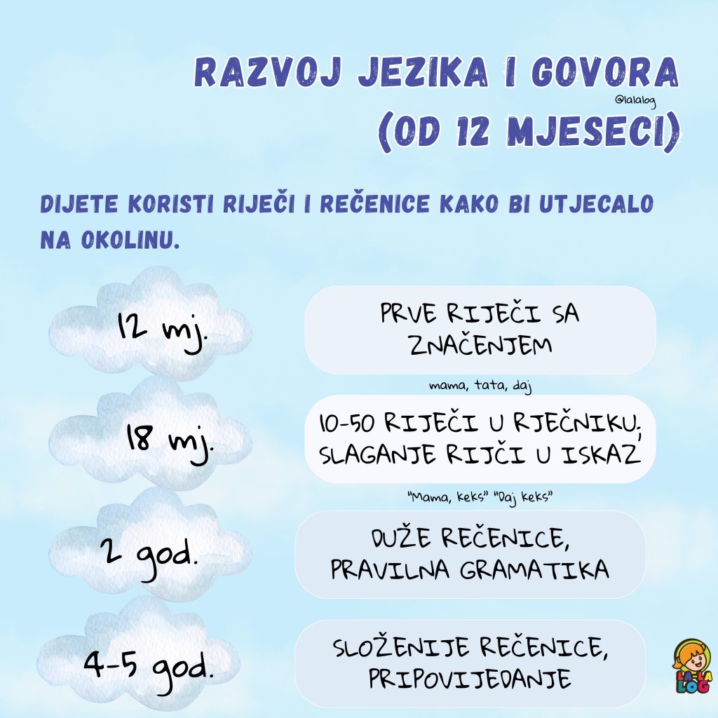 Prva riječ s jasnim značenjem obično se javlja oko prvog rođendana. Međutim, to nije stroga granica – neka djeca progovore ranije, dok drugima treba nešto više vremena. Ono što je važno jest postojanje komunikacijskih pokušaja: ako dijete koristi geste, imitira zvukove i razumije jednostavne upute, njegov razvoj ide u dobrom smjeru. U početku se rječnik djeteta sastoji od nekoliko riječi poput „mama“, „tata“ ili „daj“, ali ubrzo se počinje širiti. Do osamnaestog mjeseca dijete već može koristiti desetak do pedeset riječi, a uskoro započinje kombiniranje dviju riječi u kratke iskaze. U dobi od dvije godine rječnik broji dvjesto do tristo riječi, a djetetove rečenice postaju jednostavne, ali gramatički smislene. Treća godina donosi veći skok – rečenice se produžuju, a dijete postavlja pitanja i sve bolje izražava svoje misli.