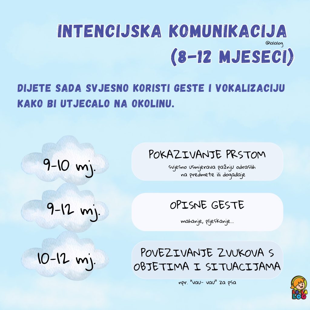 Oko osmog mjeseca dolazi do prelaska u fazu intencijske komunikacije. Dijete tada svjesno koristi geste, mimiku i vokalizaciju kako bi utjecalo na okolinu. Pokazuje prstom prema predmetima, koristi geste poput mahanja ili pljeskanja te uspostavlja sve intenzivniji kontakt očima s odraslima. Ovo je ključno razdoblje jer dijete uči povezivati zvukove s objektima i situacijama, što će mu uskoro omogućiti izgovaranje prvih riječi s jasnim značenjem.