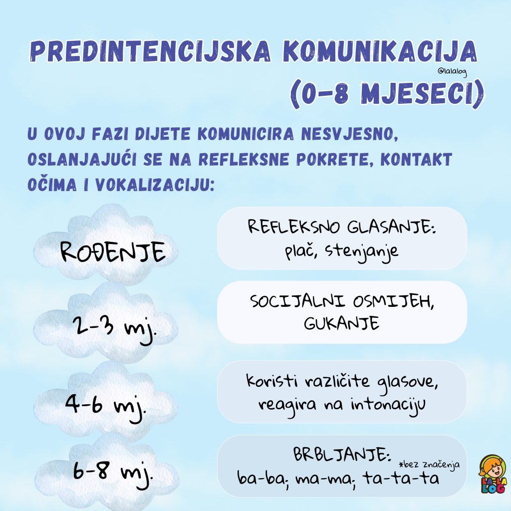 U prvim mjesecima života dijete se oslanja na refleksne pokrete, izraze lica i vokalizaciju kako bi komuniciralo s okolinom. Ova faza naziva se predintencijska komunikacija jer dijete nesvjesno signalizira svoje potrebe i reakcije. Već s 2-3 mjeseca pojavljuje se socijalni osmijeh, a dijete počinje proizvoditi prve zvukove poput gugukanja, čime započinje proces glasovne interakcije. Kako se približava šestom mjesecu života, njegovi glasovi postaju raznovrsniji, a reakcije na intonaciju govora sve izraženije.